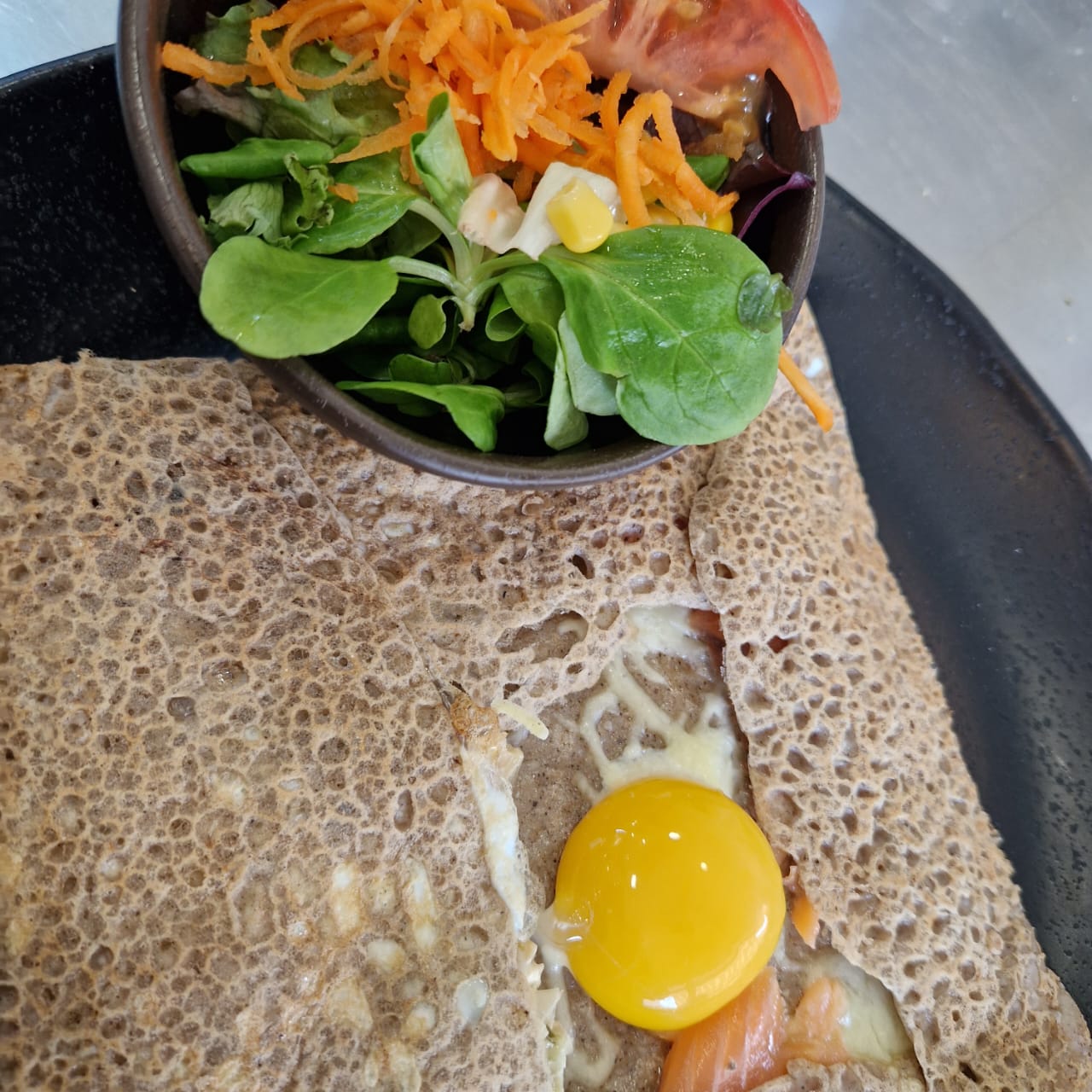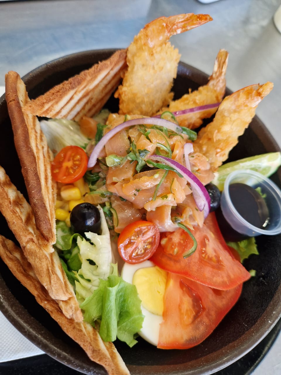 Salad, Raw Vegetables, Boiled Egg, Smoked Salmon, Avocado, Shrimp Fritter