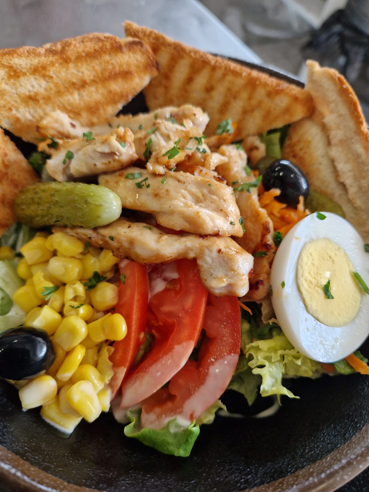 Salad, Raw Vegetables, Chicken, Bacon, Poached Egg, Parmesan Cheese