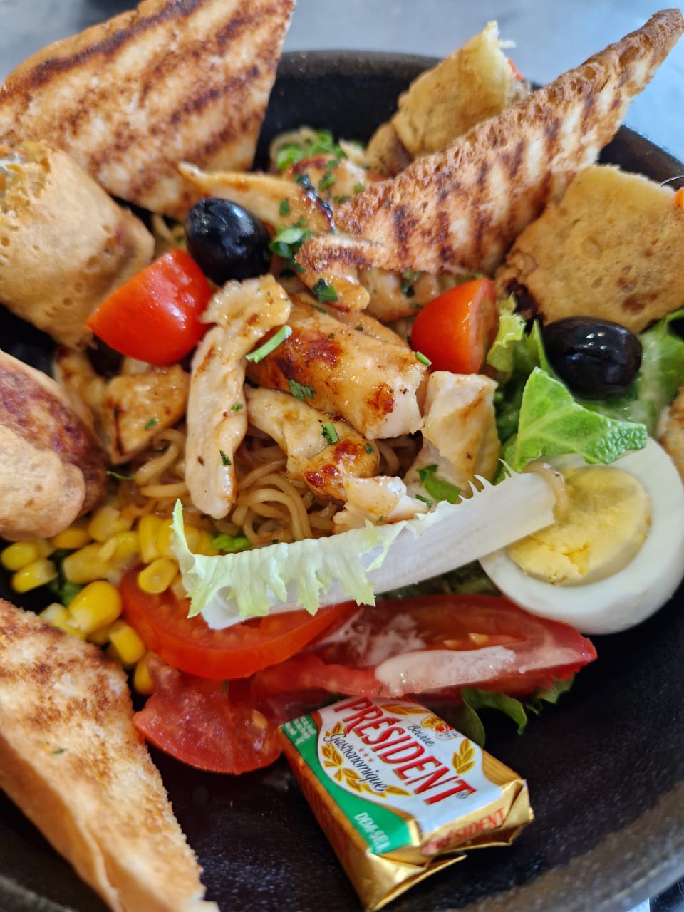 Salad, Raw Vegetables, Soy Chicken, Hard-Boiled Egg, Nems, Chinese Noodles