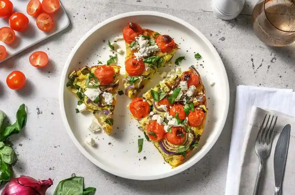 Sauce Tomate, Courgettes, Aubergines et Poivrons Marinés, Oignon, Persillade, Mozzarella, Olive, Origan