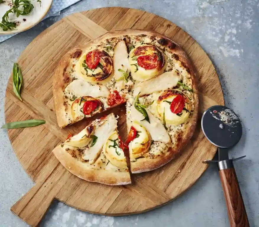 Fresh Cream, Chicken, Mushroom, Cherry Tomato, Pesto, Parmesan, Mozzarella, Olive, Oregano