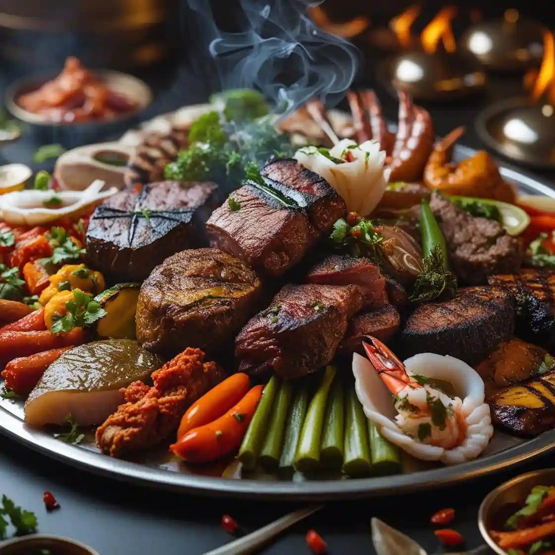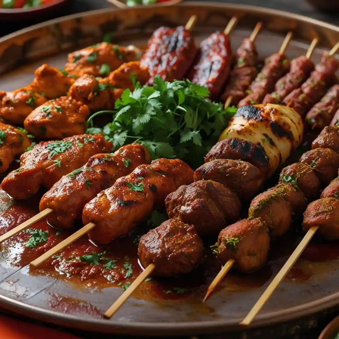 A Mouthwatering Selection of Marinated Meats—Chicken, Lamb, and more—Grilled to Smoky Perfection, Offering a Rich Burst…