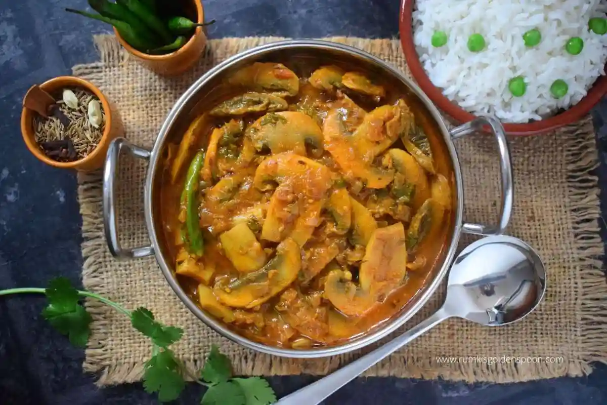 Tender mushrooms cooked in a rich, flavorful gravy with a blend of spices,