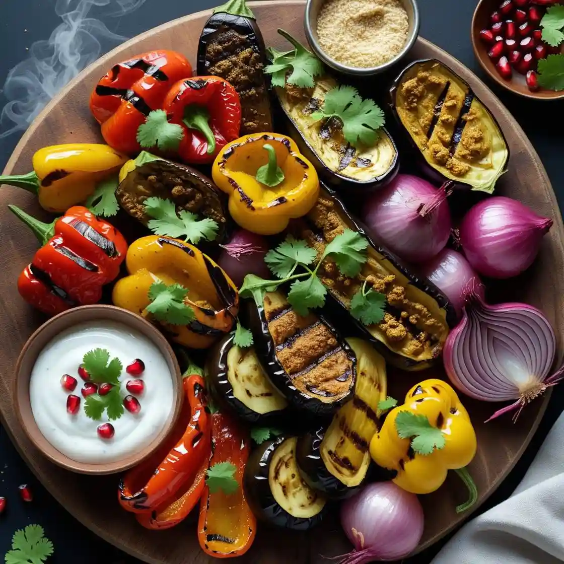 A Colorful Assortment of Vegetables Marinated, Grilled to Perfection and Smoked, Offering a Delicious Blend of Flavors…
