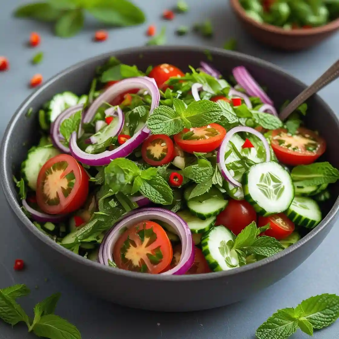 A refreshing Indian Salad with Onions, Tomatoes and Cucumbers. Our version adds a Little Chilli and Mint.