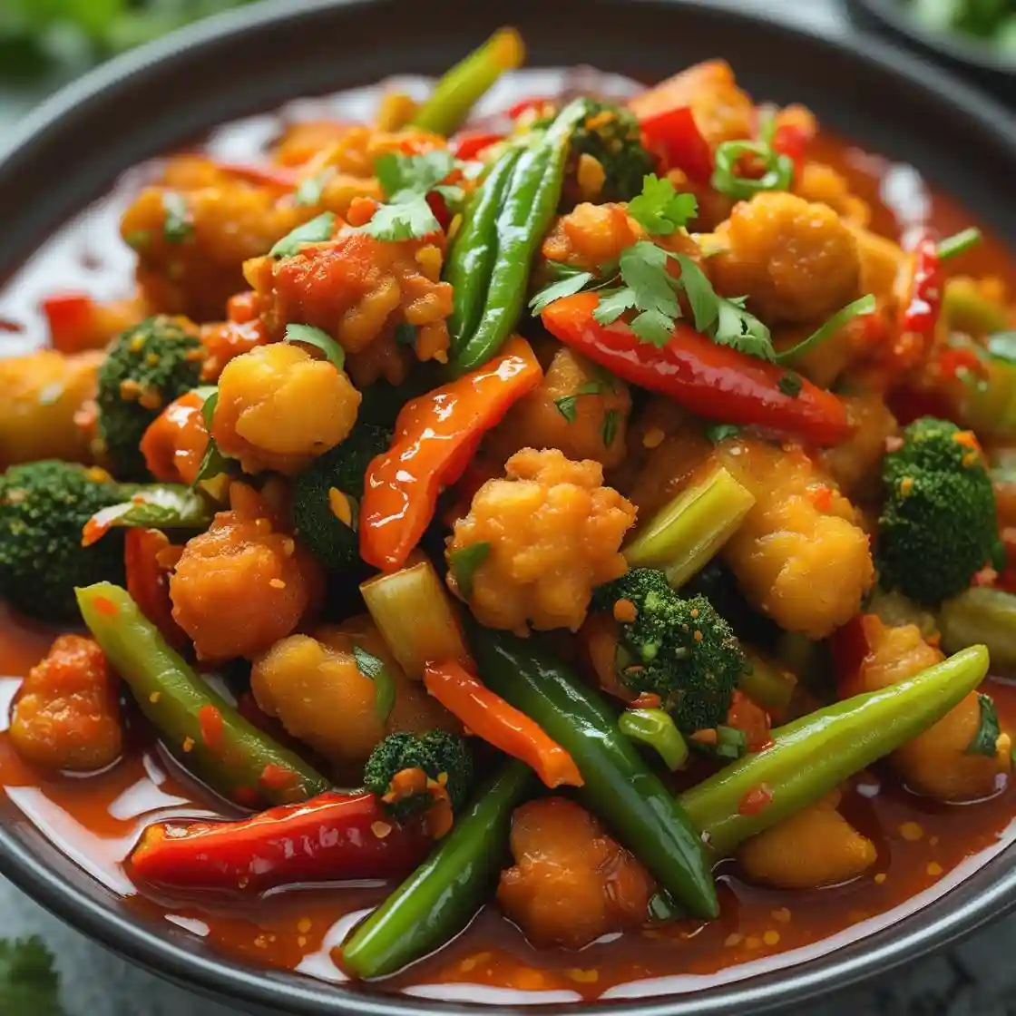 Crispy mix of Vegetables Tossed in a Flavorful, Spicy, and Tangy Indo-Chinese Sauce.