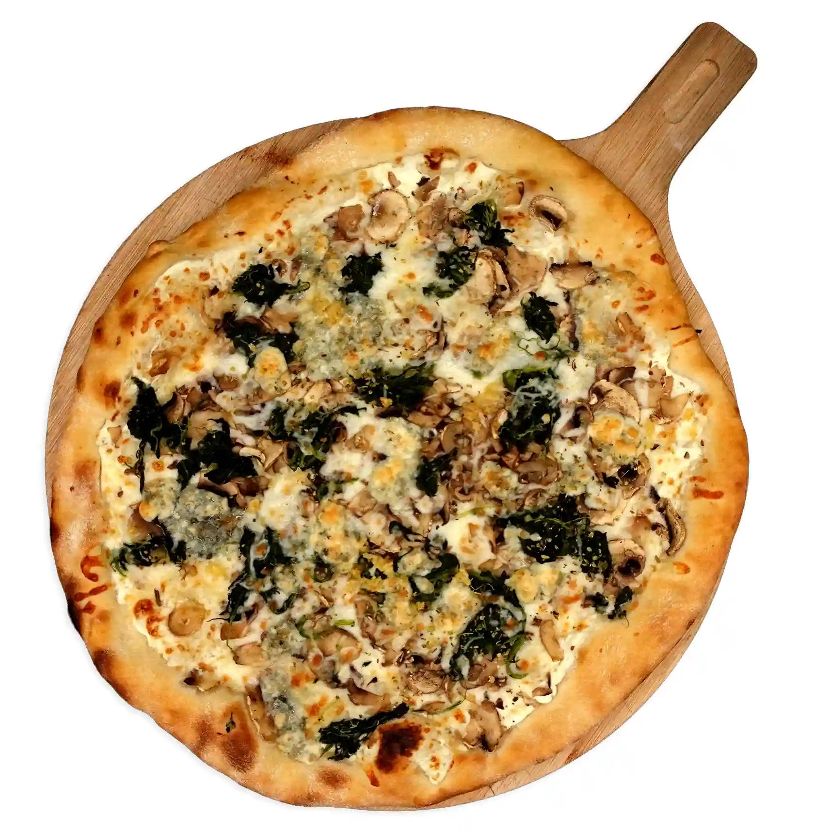 Tomato sauce, Mushrooms, Peppers, Onions, Spinach, Olives, Mozza, Emmental