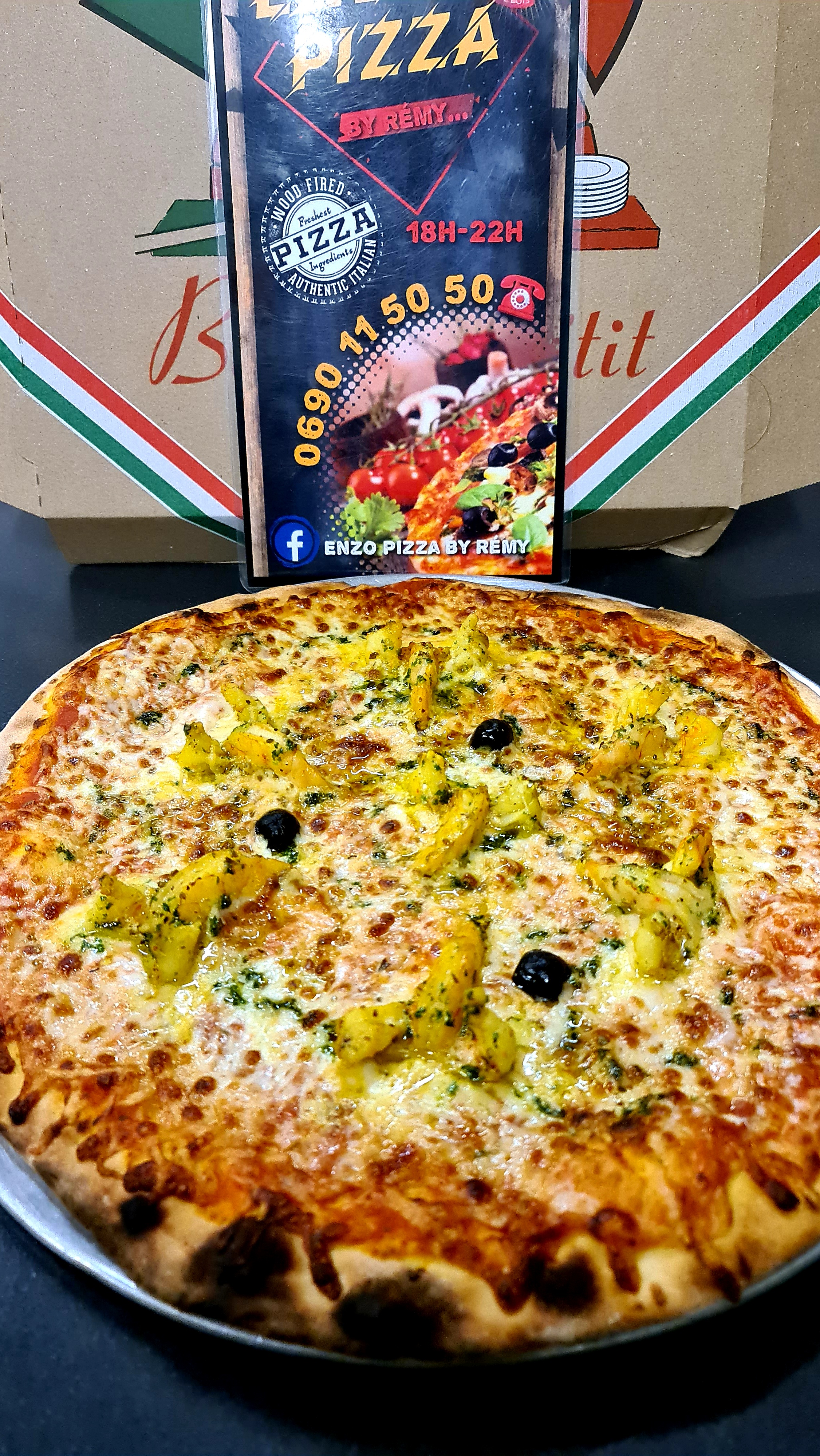 Tomate, Fromage, Lardon, Reblochon, Pommes de Terre, Crème, Olive, Origan