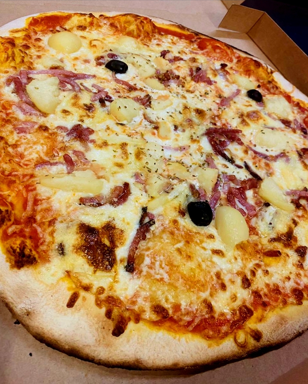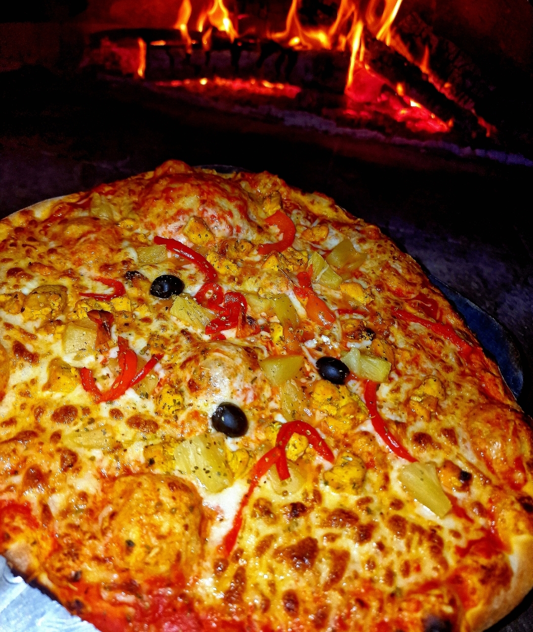 Tomate, Fromage, Poulet, Ananas, Poivrons, Olive, Origan