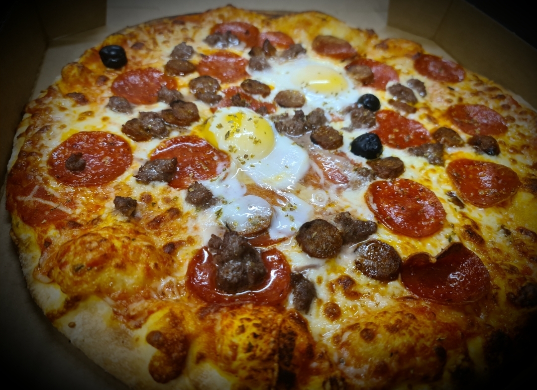 Tomate, Fromage, Pepperoni, Viande Haché, Merguez, 2 Oeufs, Olive, Origan